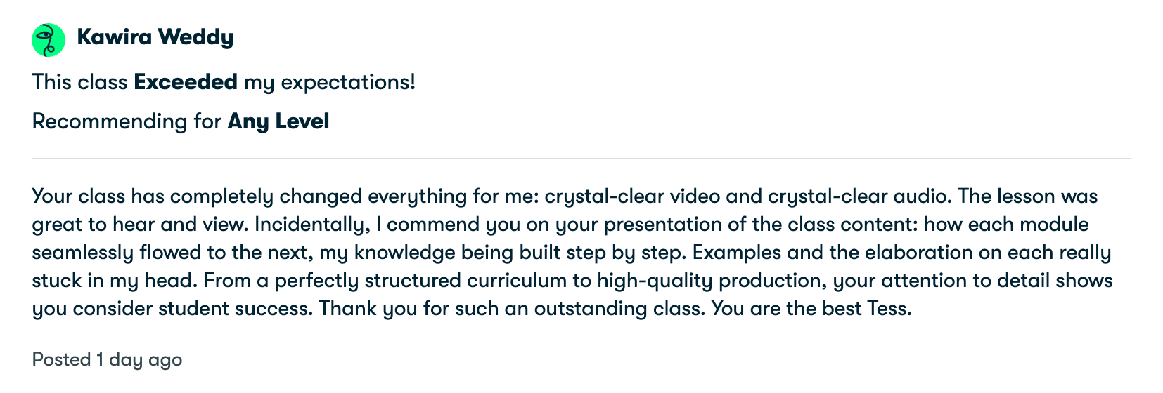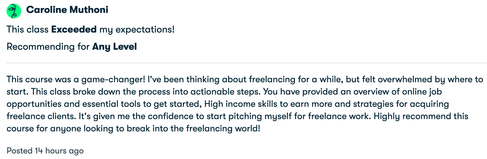 If I could make it through all those late nights and rejections, and eventually build a successful online career, you can too. But it doesn't have to take you 7 years, and you don't have to do it alone and confused. This class is meant to guide you. Thousands of people have already joined the class, and I’m thrilled to see their enthusiasm and the steps they’re taking. Will you be one of them?